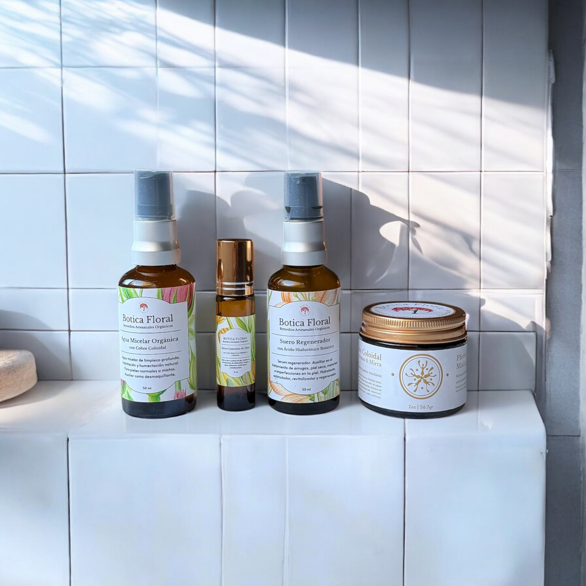 - Plata Coloidal: Actúa como regeneradora, limpiadora y purificadora. Acelera la cicatrización, atenúa marcas y cicatrices.