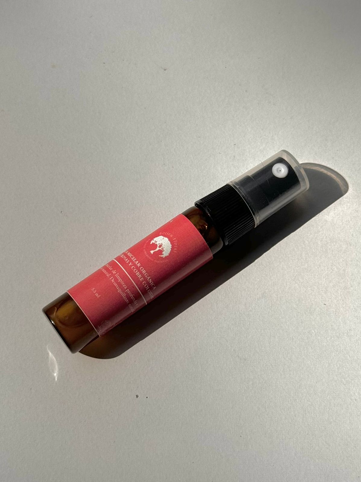Elaborado con: Agua de rosas Rosa centifolia, Agua de Hamamelis Hamamelis virginiana, Cobre Coloidal, Aceite de Jojoba Orgánico Simmondsia chinensis, Aceite Esencial Lavanda Lavandula angustifolia y Árbol de Té Melaleuca alternifolia orgánicos, Vitamina E, Flores de Bach, Bush y California.