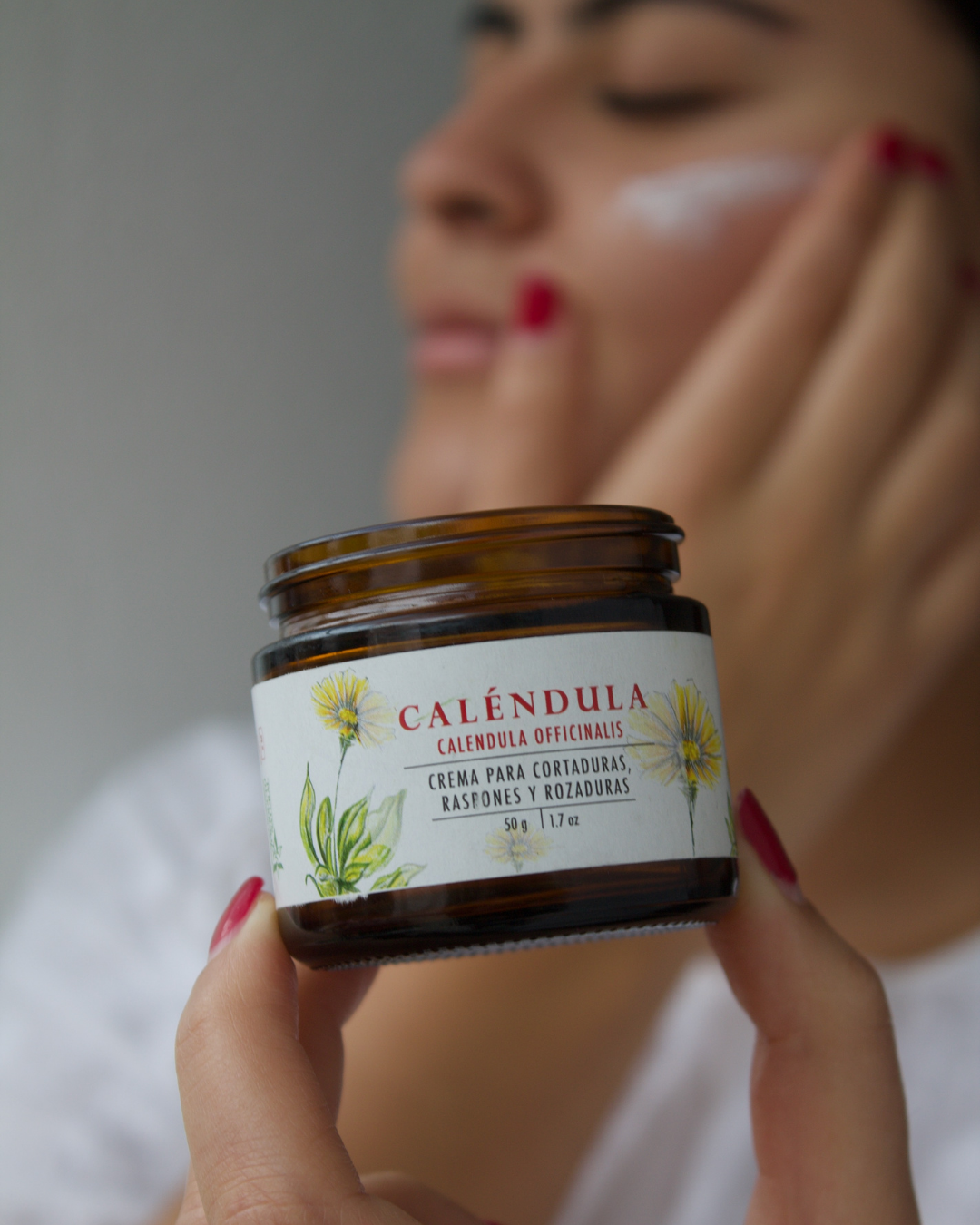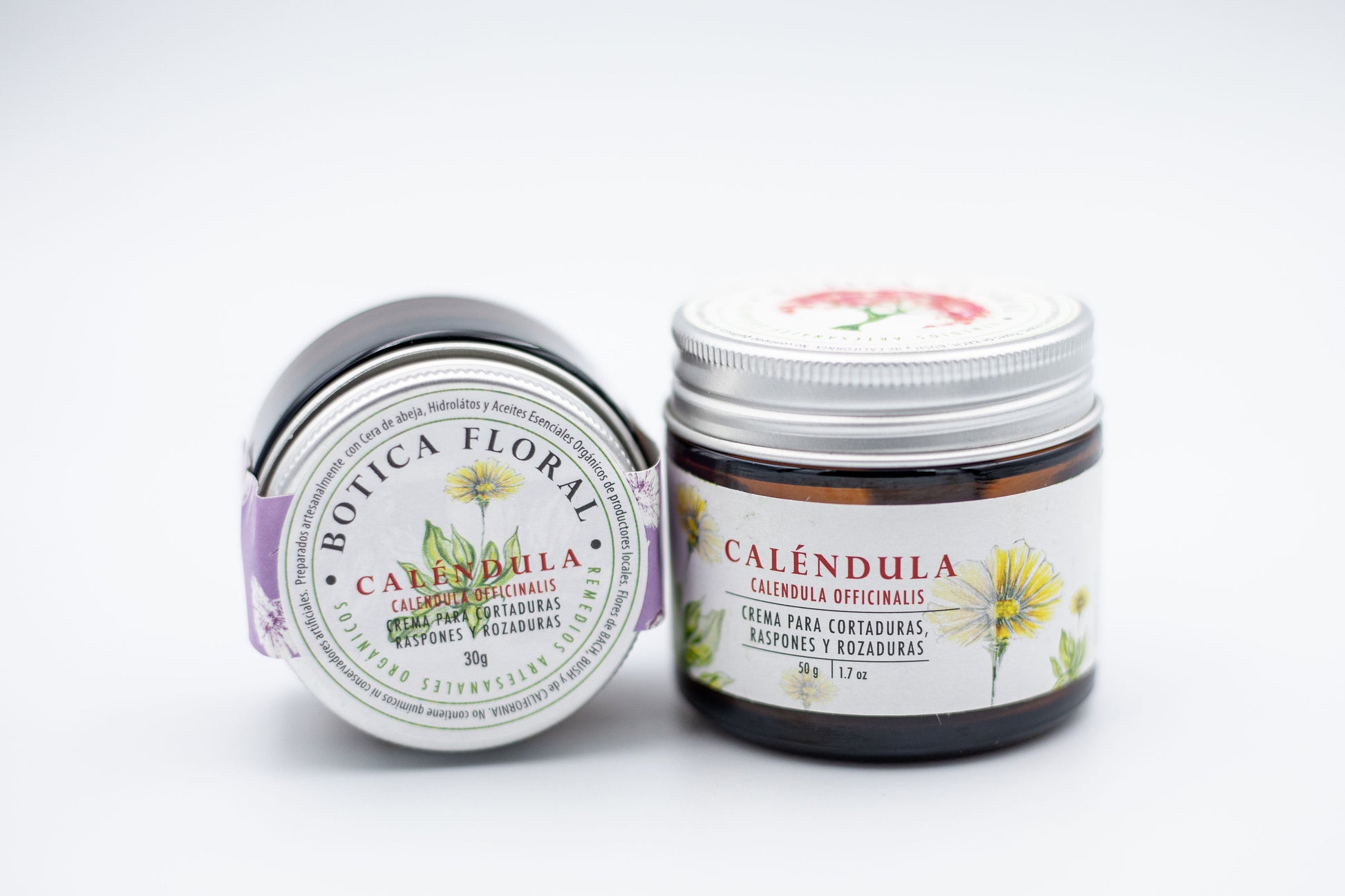 - Crema de Calendula: Auxiliar en el tratamiento de rozaduras, cortadas, cicatrices, irritaciones y quemaduras de primer grado en la piel. Desinfecta, desinflama y regenera tejido. Puede ser utilizado directamente en heridas para ayudar a cicatrizar.