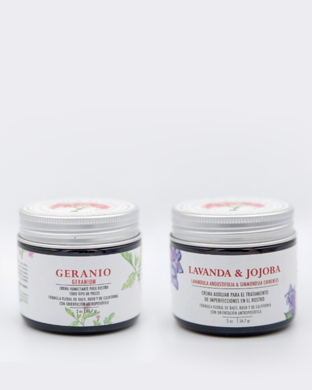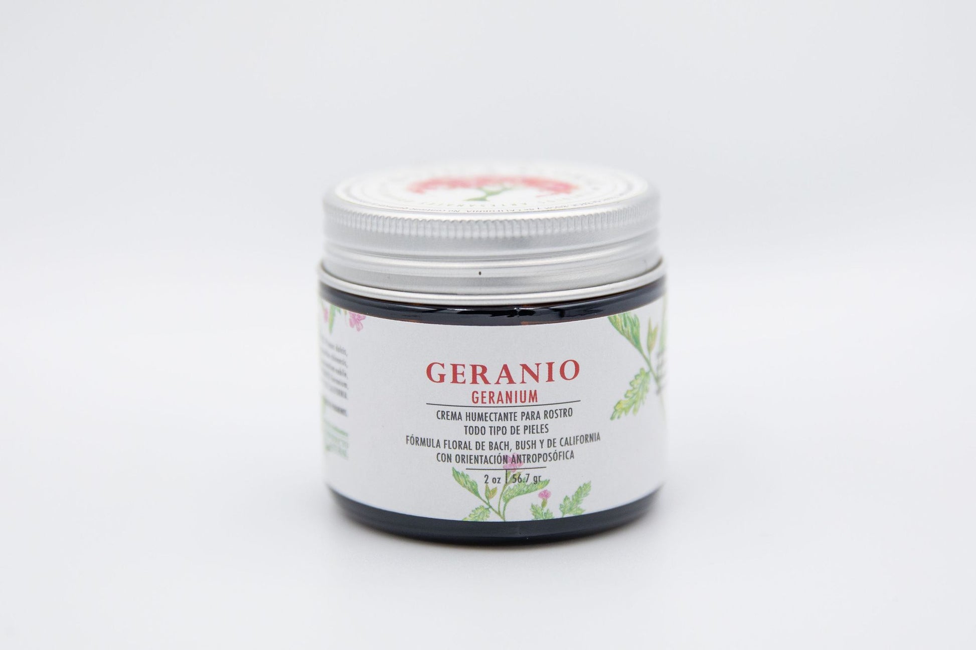 - Crema de Geranio 2 oz / 56.7 g: Humectante para rostro, pieles jóvenes y con rojeces. Usar de día. El Geranio es Antiséptico, Antiinflamatorio, Astringente, Cicatrizante (estimula el crecimiento de las células sanas de la piel).